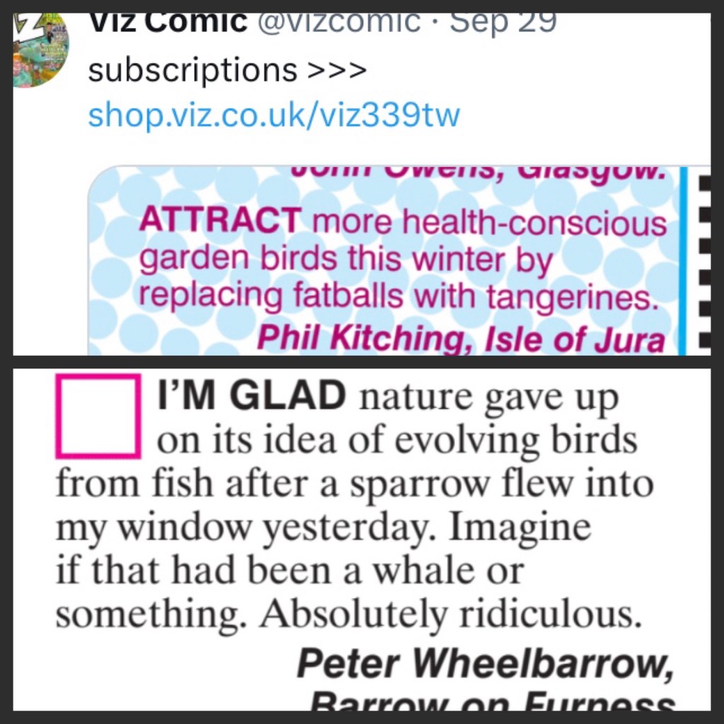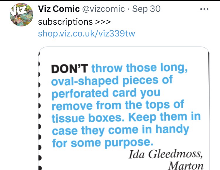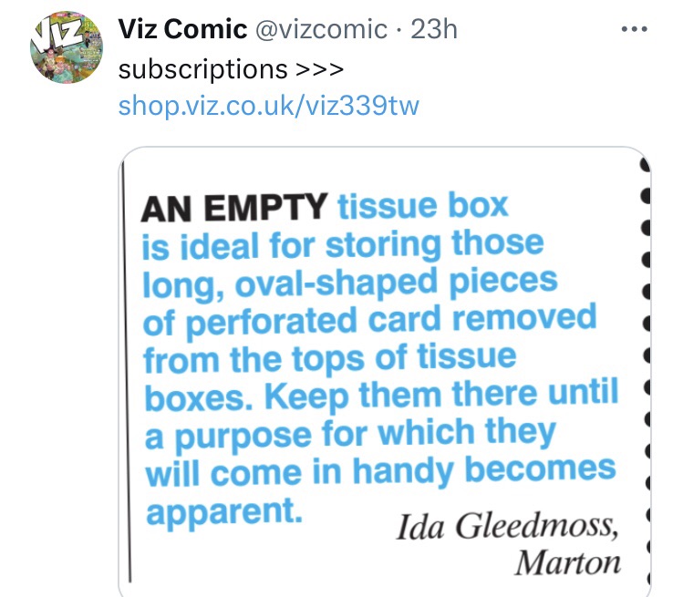 A bit of light relief – taking 10-15 minutes out to sit (yes sit!) on my lovely coccyx cushion and catch up on Viz crap jokes.